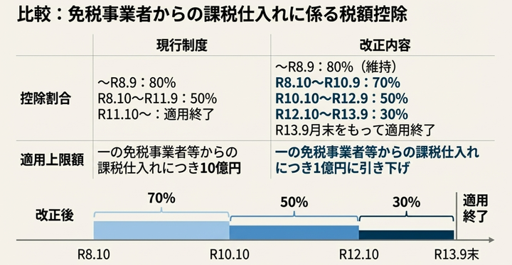 インボイスのない外注先等からの課税仕入れ(資産の取得や費用の支払い)については、現行では支払った消費税分の80%の仕入税額控除(消費税の控除)が認められていますが、2026年10月から50%に引き下げられる予定でした。